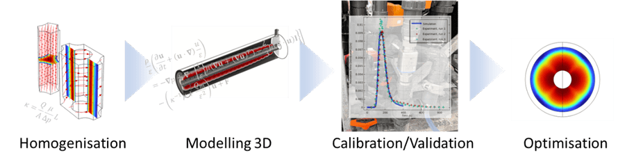 The membrane involved domains of different porosities and anisotropic permeabilities. Hence, microscale models were used to quantify these, which turned out to be very successful. Analysis of experimental stationery operating data and concentration tracer step-responses (residence time distribution) were used to calibrate and validate the model prior to geometry optimisation. Various geometries and operating points were simulated.