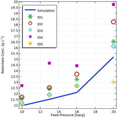 The flux proportionality constant, Bsalt (Equation 5), and the mass transfer coefficient, ksalt (Equation 2), are fitted in the COMSOL Multiphysics model to experimental data set. Figure 6 depicts both simulation and experimental data used to fit Bsalt and ksalt . A reasonable fit is achieved. The experimental conditions can be seen in the figure caption. The feed flow rate at feed pressure 20[barg] was limited to 1500 [ L h-1] rather than 2400 [ L h-1] as the rest of the data, due to limitations in feed pump capacity.