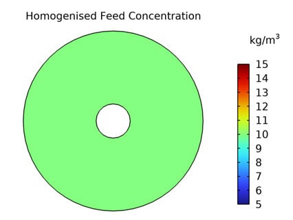 Figure 7. Simulation of a uniform feed concentration field versus a non-uniform concentration feed field. Pin.s = 16 [barg], Inlet Concentration Cin.avg = 10 [g L-1] , and Feed Flow rate Qin.s =2400 [ L h-1]. A and B: Concentration field in plane perpendicular to the inlet flow direction. C and D: Unwound envelope volumetric flux. The horizontal axis is feed flow direction (from left to right) and the vertical axis is the arclength of the spiral. The permeate flow goes downwards towards the centre pipe. E and F: Wound envelope volumetric flux.