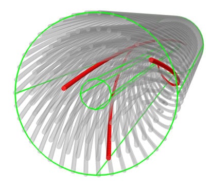Figure 1. Membrane Configurations. A: Hollow Fibre (HF) bundle. B: Spiral Wound (SW) bundle. Note that channel numbers, sizes, and curvatures are selected only for visualisation purposes. The red highlights indicate flow domains, which in A are geometrical cylinders (fibres) with direct flow out to the lumen and in B: spirally wounded membrane ensembles of stacked membrane sheets, permeate carrier (drain to centre tube), and feed spacer.