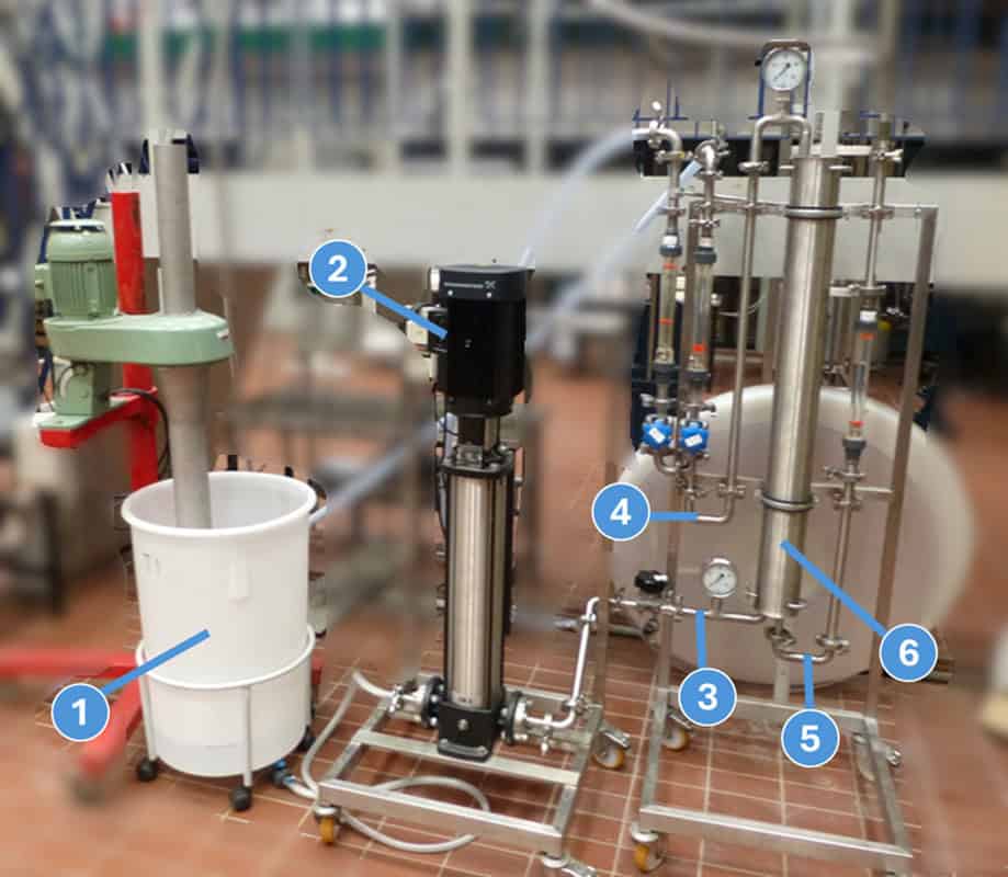 The pilot scale RO process is illustrated in Figure 3. It consists of a feed tank (1), high pressure pump (2), the feed line (3), the retentate line (4), the permeate line (5) the membrane module (6) that contains the membrane cartridge. Analog manometers at feed inlet and retentate outlet as well as flowmeters on retentate and permeate side are present. Note that only the permeate out from the centre pipe in the same side as the feed in tube of Figure 2 B is utilised in the setup.