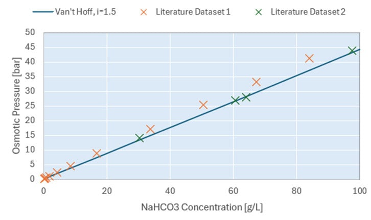 The osmotic pressure is calculated using Van’t Hoff Equation (Equation 1) for dissociation of NaHCO3 using i = 1.5, as bicarbonate HCO3 is partly present as dissolved carbon dioxide.